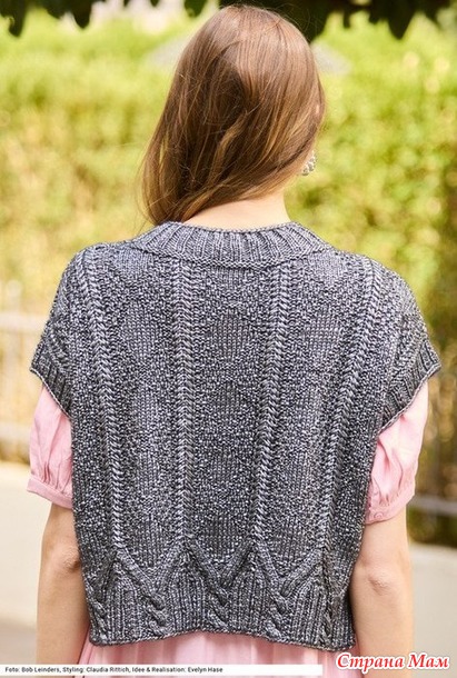 Для планок на круговые спицы набрать по краям пройм по 96 (108) п. и связать 2 круг. р. узором 3, 1 круг. р. узором 2 и 10 круг. р. узором 1, при этом в последнем ряду узора 1 провязать в каждом изнаночном рубчике по 2 п. вместе изнаночной = 72 (81) п. Затем закрыть петли при помощи планки из полого шнура, как описано выше. Выполнить боковые швы, при этом нижние по 6 см оставить открытыми для разрезов.