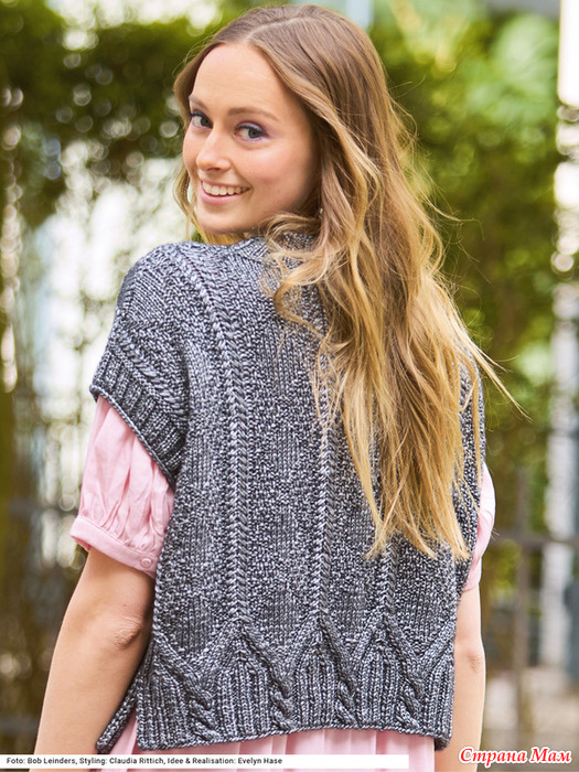 Короткие просторные жилеты снова в тренде, и эта вязаная модель не исключение. Ее можно стилизовать любым способом, но в то же время чудесный рельефный узор из «кос» и слегка блестящая пряжа добавят в образ изысканную нотку.