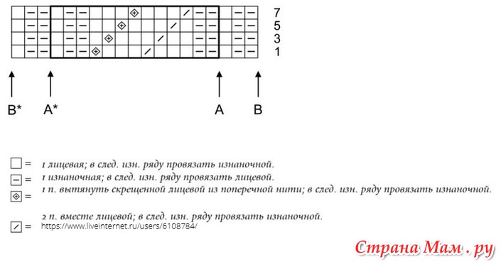 o Кром., начать у стрелки A (B/A/A), провязать 0 (3/0/0) п. до раппорта, выполнить раппорт (13 п.) 8 (8/9/10) раз, закончить у стрелки A* (B*/A*/A*), провязать 0 (3/0/0) п. после раппорта, кром.