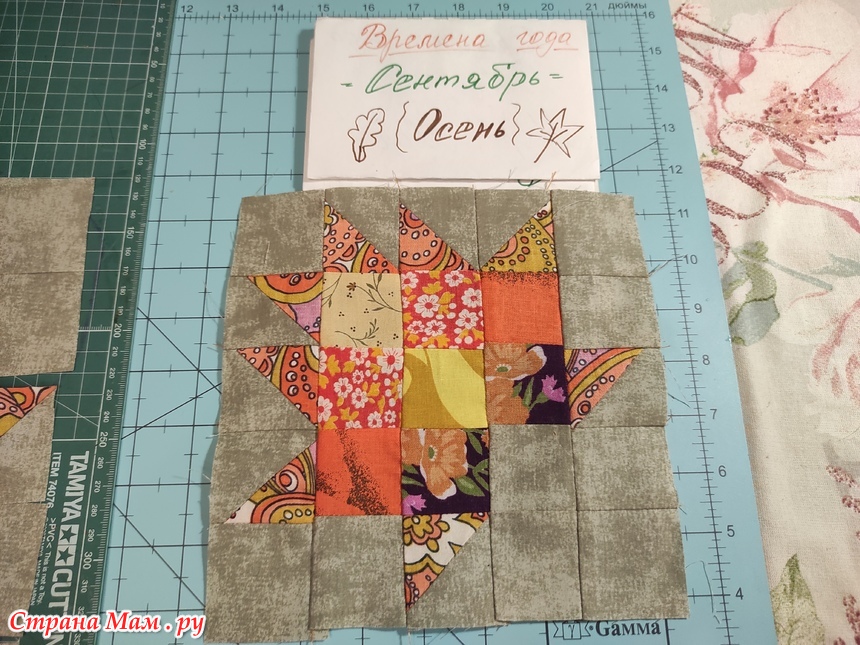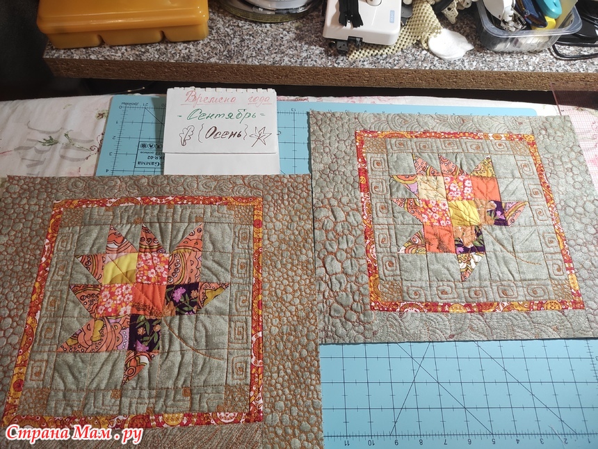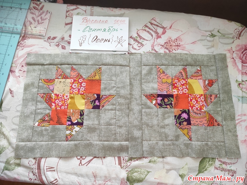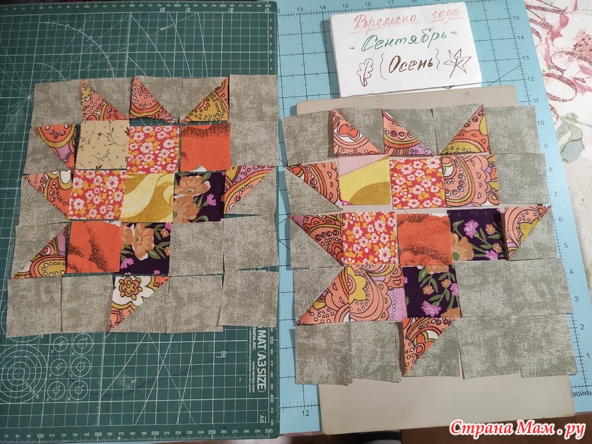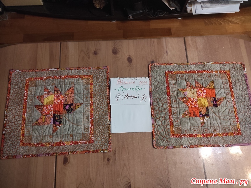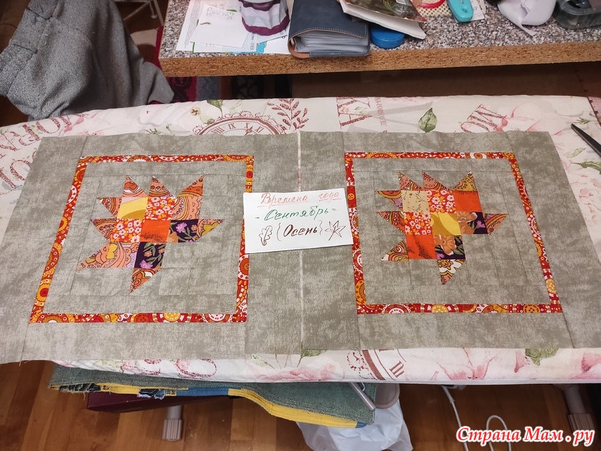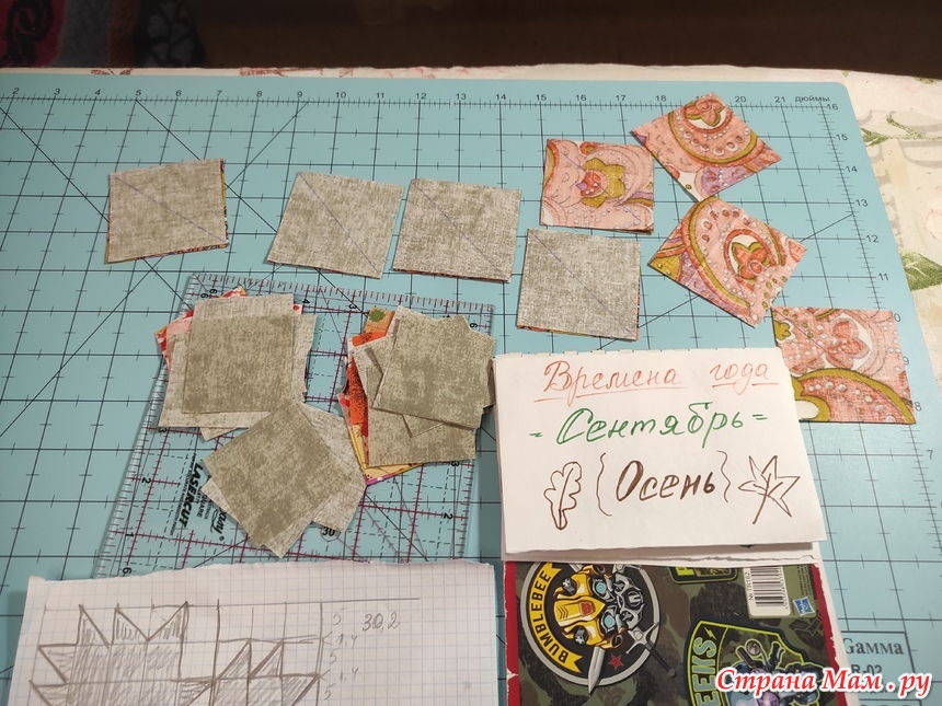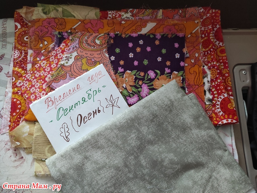 Привет всем! Мой второй отчет по заявке на сентябрь. Лоскутки и стежка - получились новые подставочки - ланчматы. Начиналось все так - сбор различных тканюшек и прорисовка эскиза.
