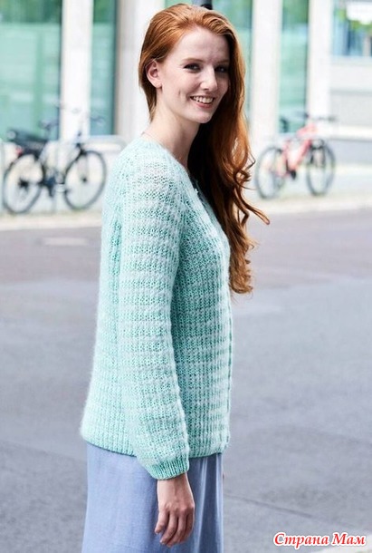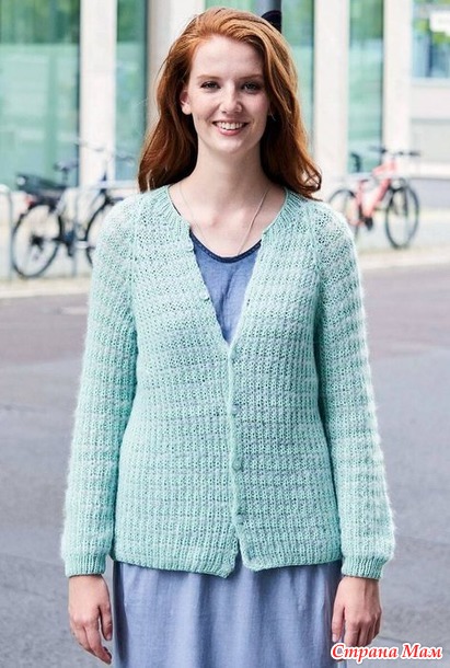 Правая полочка: вязать так же, как левую полочку, но в зеркальном отображении и с 7 отверстиями для пуговиц.