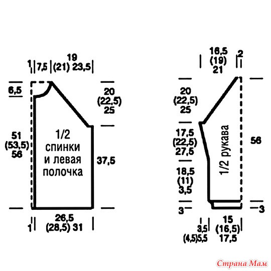 Через 37,5 см = 120 р. от начального ряда закрыть с обеих сторон для регланных скосов 1 х 4 п., затем подчеркнуто убавить в каждом 4-м р. 11 (13) 15 х 2 п. и далее в каждом 6-м р. 3 х 2 п.