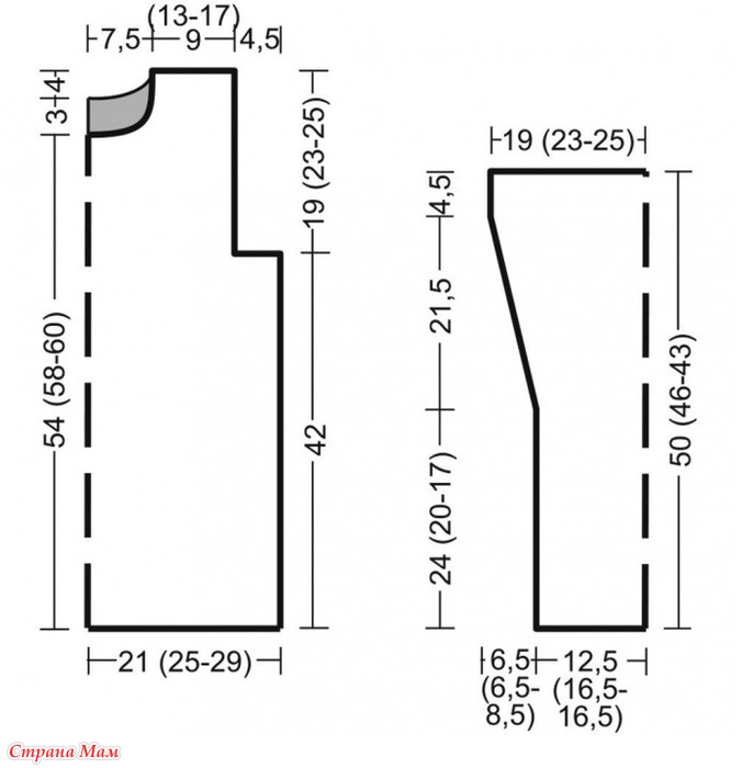 Через 15 (19-21) см = 34 (46-52) р. от начала пройм закрыть для горловины средние 37 п. и сначала закончить левую сторону.