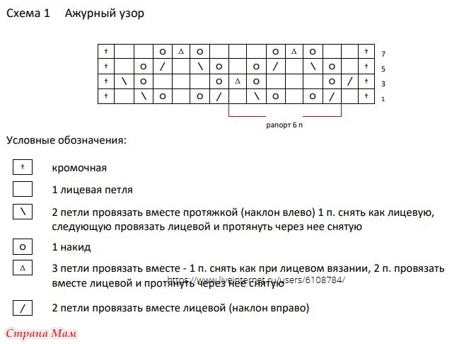 Ажурный узор – (см. схему 1) Начинаем – кромочная, 1 лиц. п., потом вяжем рапорт из 6 п. повторяя его 14 (15, 16) раз, и заканчиваем 6 петлями после рапорта, кромочная.