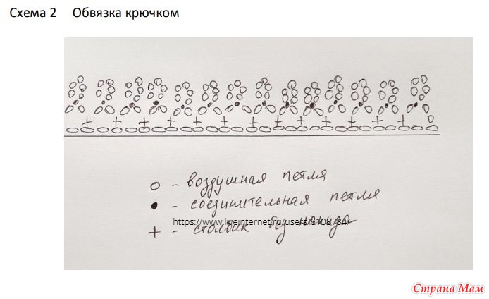 Обвязка крючком – обвязываем все края изделия. (см. Схема 2) Для этого, привязываем нить к одному из швов, вяжем 1 воздушную петлю и делаем на ней пико из 5 воздушных петель, замыкаем его в эту воздушную петлю, еще одна воздушная, 1 столбик без накида во вторую петлю края. И повторяем, 1 воздушная, на ней пико из 5 петель, замыкаем в нижнюю воздушную, 1 воздушная, столбик без накида в след. вторую петлю края. И так далее. Вяжите не туго, чтобы не стянуть край вашего изделия.