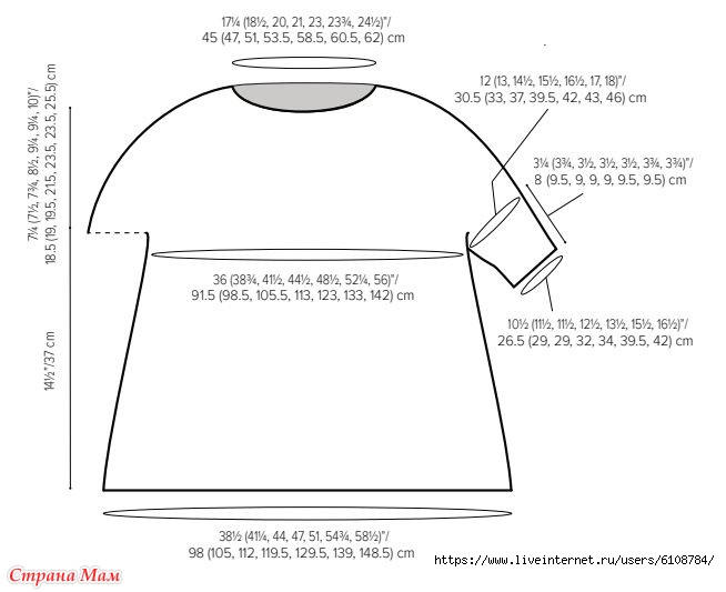 Объем груди готового изделия 91.5 (98.5, 105.5, 113, 123, 133, 142) см.