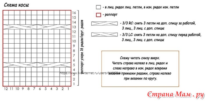 Повторять ряд наклона косы каждые 16 рядов (каждый 1 раппорт схемы, вязать с ряда 1) до конца тела.