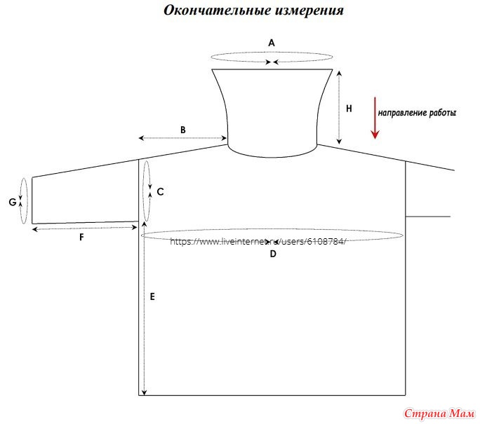 ” от подмышки, заканчивая в ряду 8 (16, 8, 8)(16, 16, 16, 16) схемы косы.