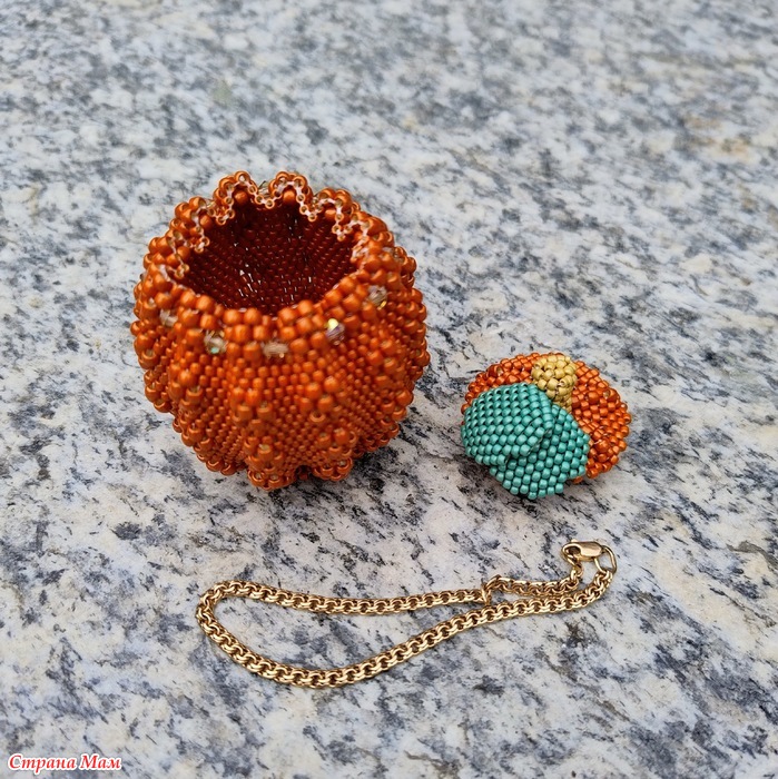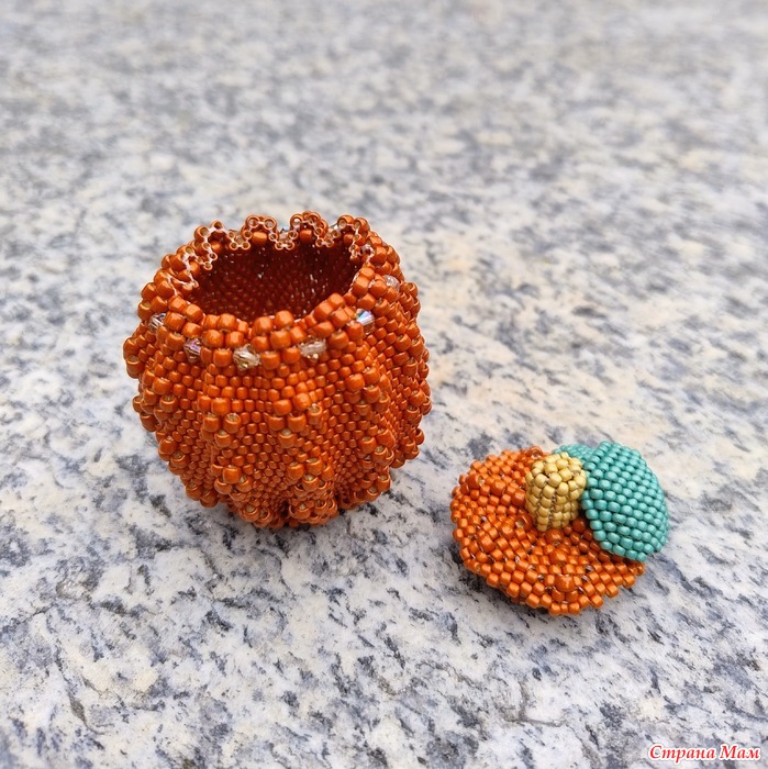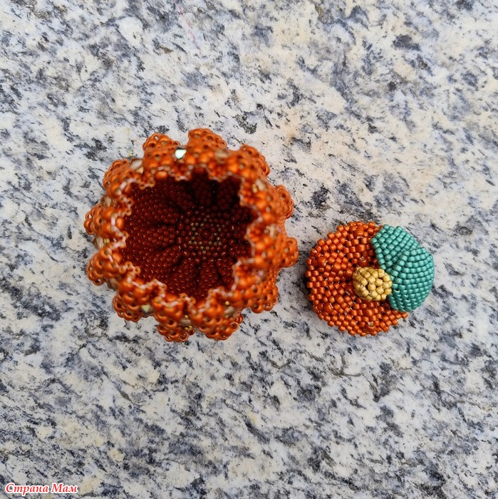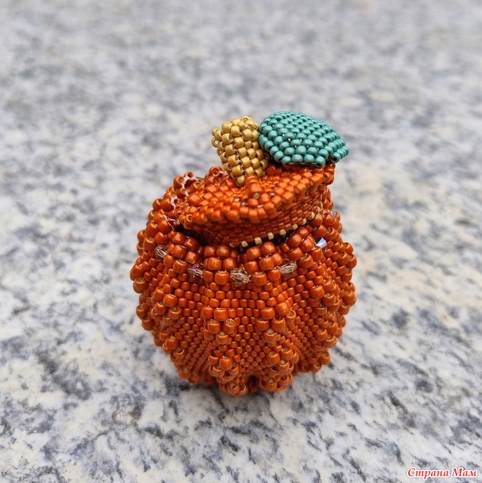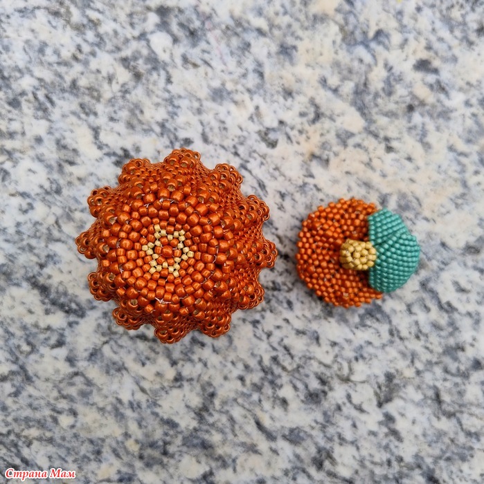 Дело в том, что в мастер-классе, по которому я плела, используется бисер Miyuki, но я не нашла красивый оранжевый цвет этой марки, и купила бисер Toho, а он отличается от Miyuki: бисеринки более высокие. Поэтому тыква моя получилась высокой, а крышка широкой.
