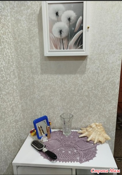 Решила я сделать поуютнее свою прихожую и связать салфетку. Но никак не могла в инете найти прямоугольную салфетку нужного размера и чтобы понравилась. И тут увидела у Азы Отрошко, в ВК, то что и связать захотелось и размер нужный. Описание платное, поэтому схем не будет. Салфетка связана из Ярнарт виолет, 282м/50 гр (нитки потолше чем в МК, поэтому салфетка получилась немного подольше), крючок 1,25, размер 28х38см.