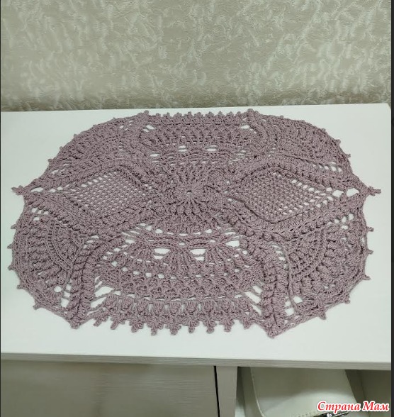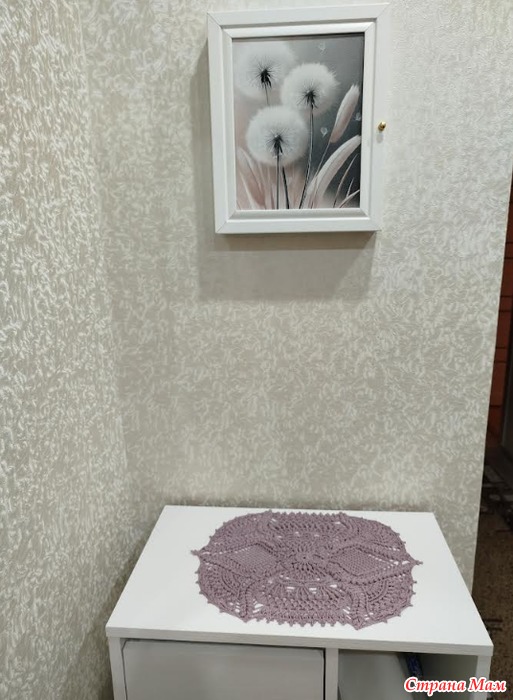 Решила я сделать поуютнее свою прихожую и связать салфетку. Но никак не могла в инете найти прямоугольную салфетку нужного размера и чтобы понравилась. И тут увидела у Азы Отрошко, в ВК, то что и связать захотелось и размер нужный. Описание платное, поэтому схем не будет. Салфетка связана из Ярнарт виолет, 282м/50 гр (нитки потолше чем в МК, поэтому салфетка получилась немного подольше), крючок 1,25, размер 28х38см.