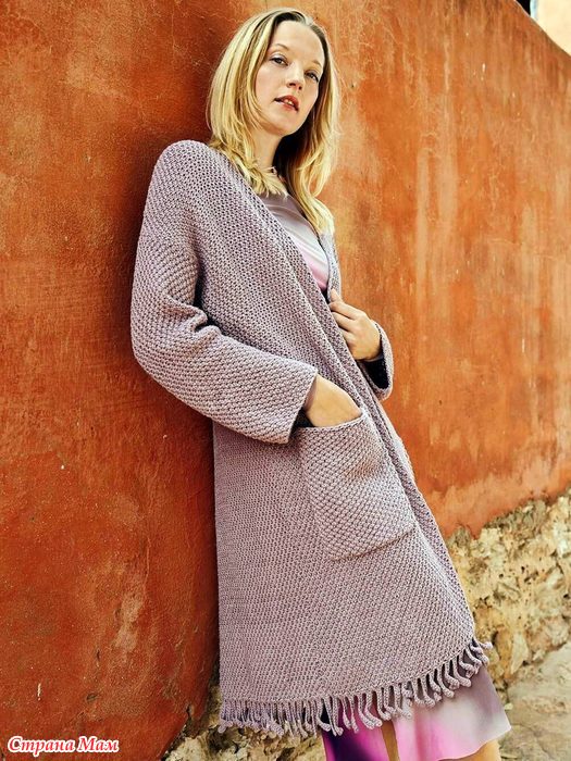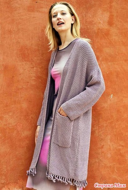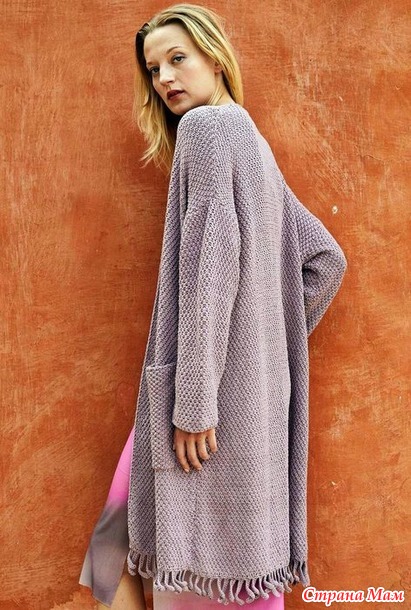 Удлинённый бледно-фиолетовый кардиган с бахромой и карманами