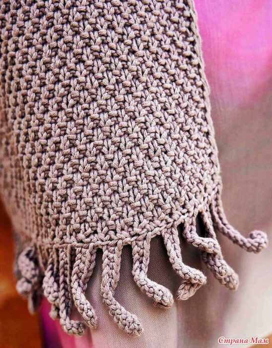 Нижний край изделия обвязать крючком, выполнив 1 р. следующим образом: нить присоединить к углу полочки, * 1 ст. б/н, 12 в.п., 1 ст. б/н в в.п. (1-й ст. б/н во 2-ю в.п. от крючка), 2 п. наборного края пропустить, от * постоянно повторять.