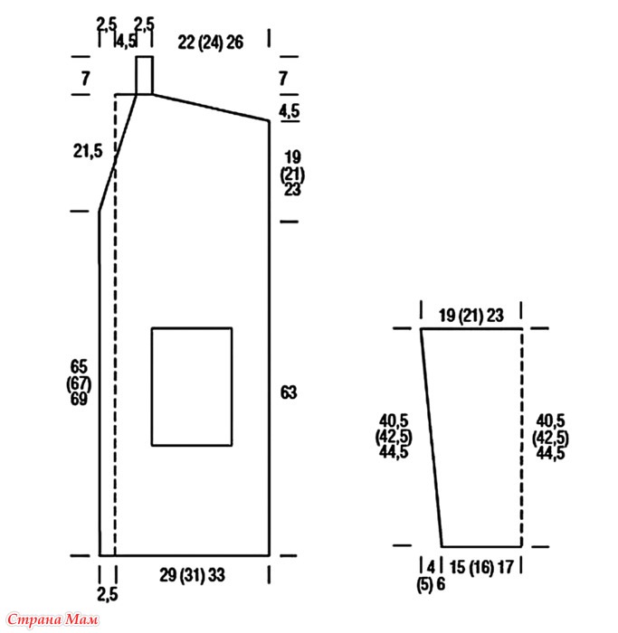 Сборка. Карманы пришить к полочкам на общей высоте 21 см на расстоянии 5 см от боковых краев. Выполнить плечевые швы.