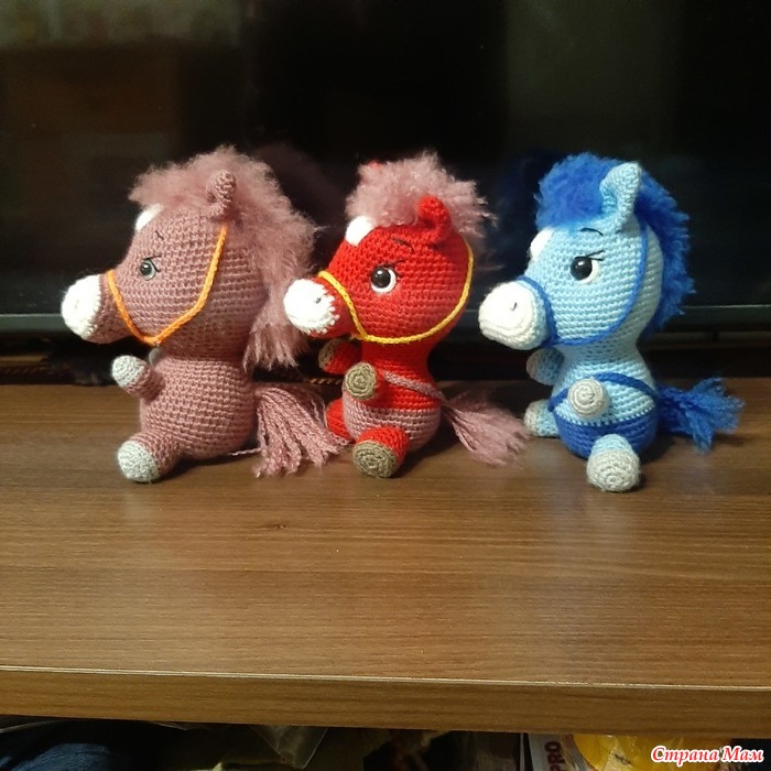 Коняшки связаны, как обычно, из Пехорки Детская новинка, акрил, 50 г 200 м, крючок 1 мм, глаза пришивные 8 мм, наполнитель – синтепон. Понадобилась пуходёрка для котов...
