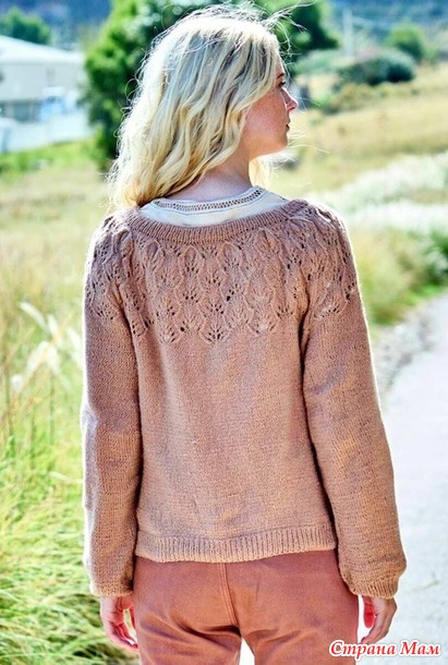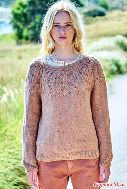 Бежево-коричневый пуловер с ажурной кокеткой «листья». Спицы.