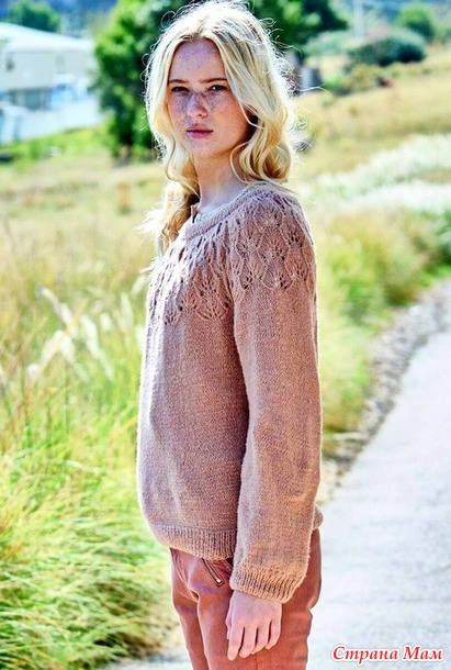 Связать эту модель очень просто: начните с эластичной резинки на манжете, а затем вяжите лицевой гладью до пройм. После того, как вы закончите нижние части спинки, переда и рукавов, самое время уделить внимание круглой кокетке. Для этого наберите все петли, одну за другой, на длинную круговую спицу и сосредоточьтесь на очаровательном узоре из листьев.