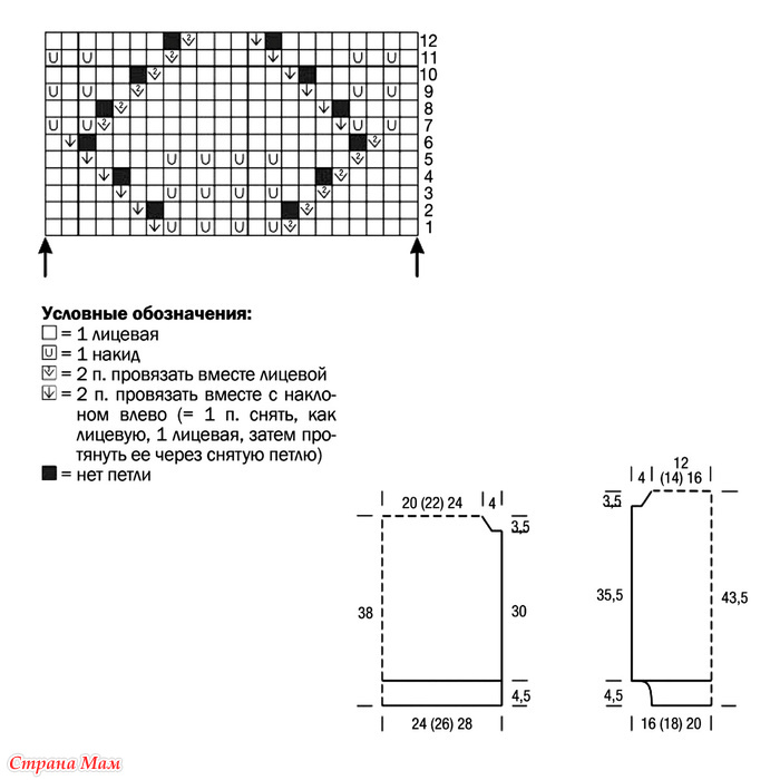 Плотность вязания: лицевая гладь — 25 п. х 37 р. = 10 х 10 см; ажурный узор — 31 п. х 42 круг. р. = 10 х 10 см.