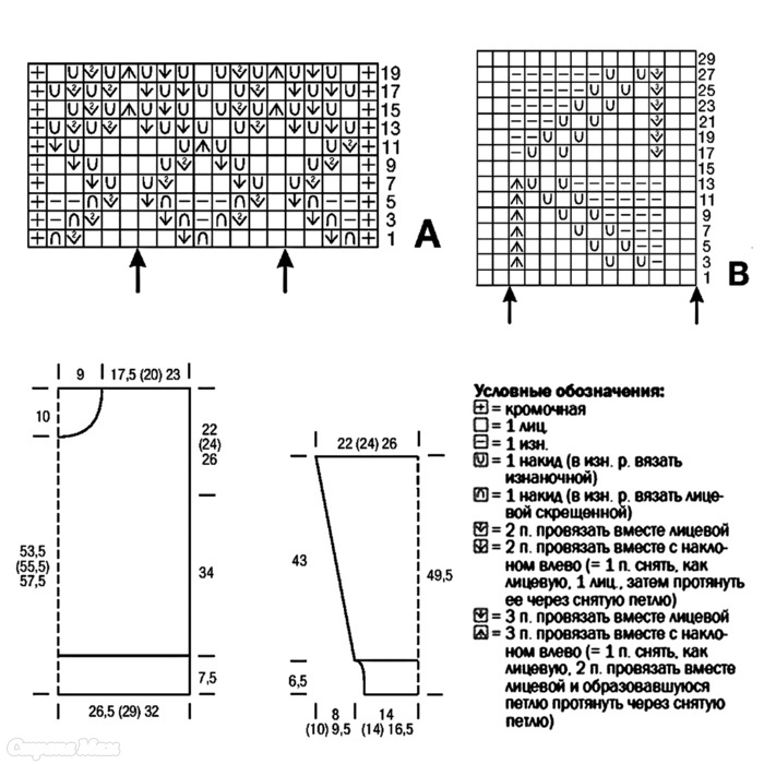 Ажурный узор. Количество петель кратно 12 + 2. Вязать по схеме В. На ней приведены только лицевые ряды; в изнаночных рядах все петли и накиды вязать изнаночными. Раппорт между стрелками постоянно повторять и закончить петлями после левой стрелки. 1-30-й р. выполнить 1 раз.