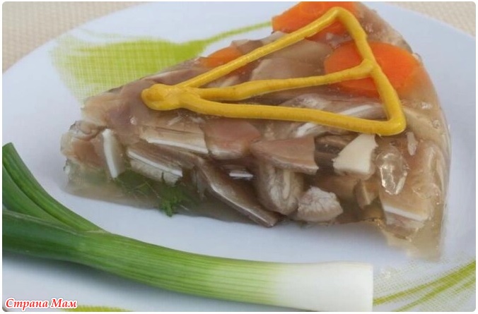 Если у вас слабо застывают холодцы, что бы не использовать желатин - добавьте свиные уши. Даже, если вы их не едите, то можете просто не использовать в самом блюде. Можете ножом снять желе, а хрящик выкинуть. Хотя дети очень его любят.