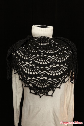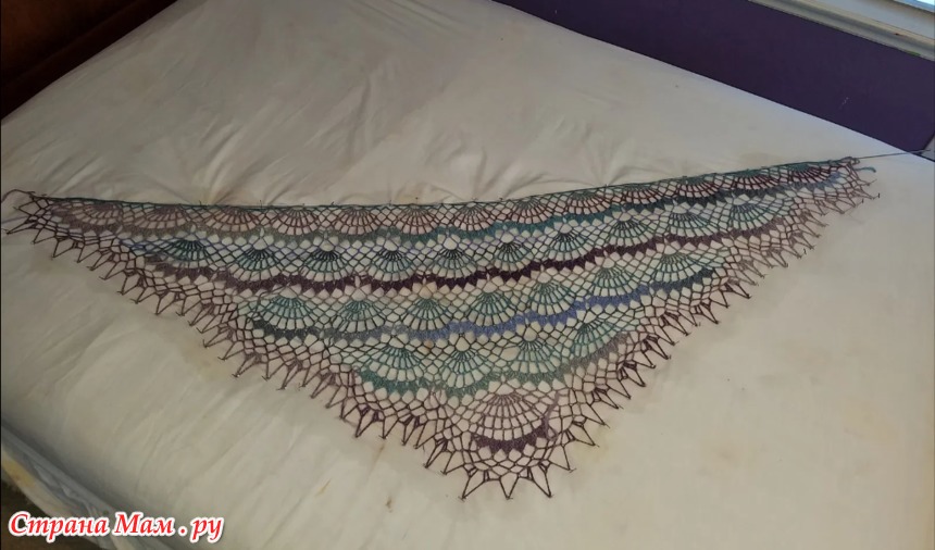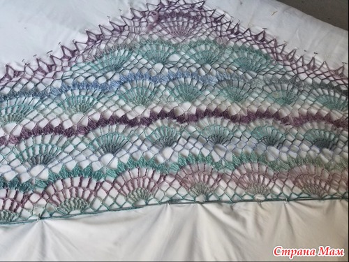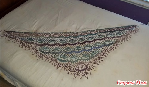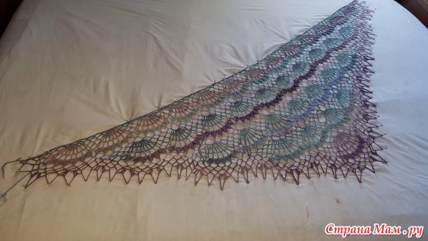 Вот схема, шаль вязалась от широкого конца с обрывом Нити для следующего ряда ракушек.
