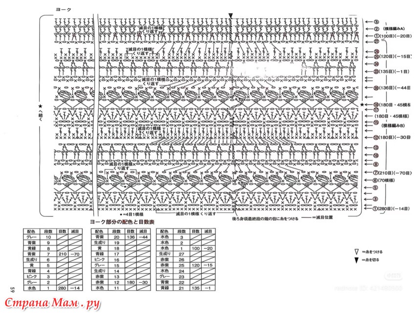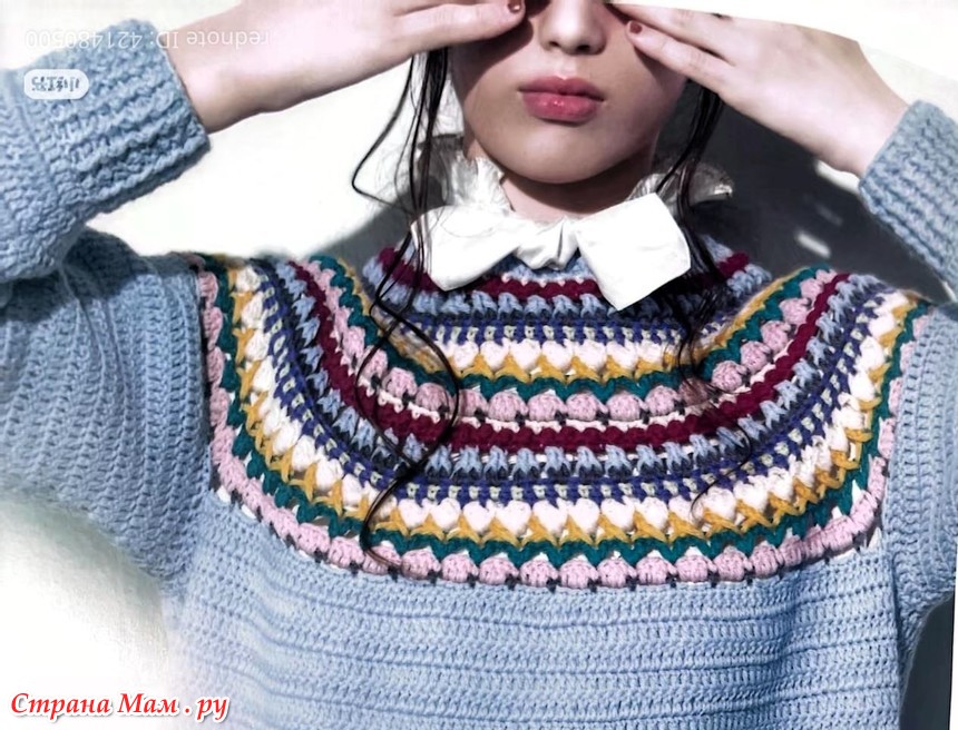 Набрать 42 воздушные петли светло-голубой нитью, вязать узор А 8 рядов, прибавить 6 петель и вязать столбики с накидом с обеих сторон.