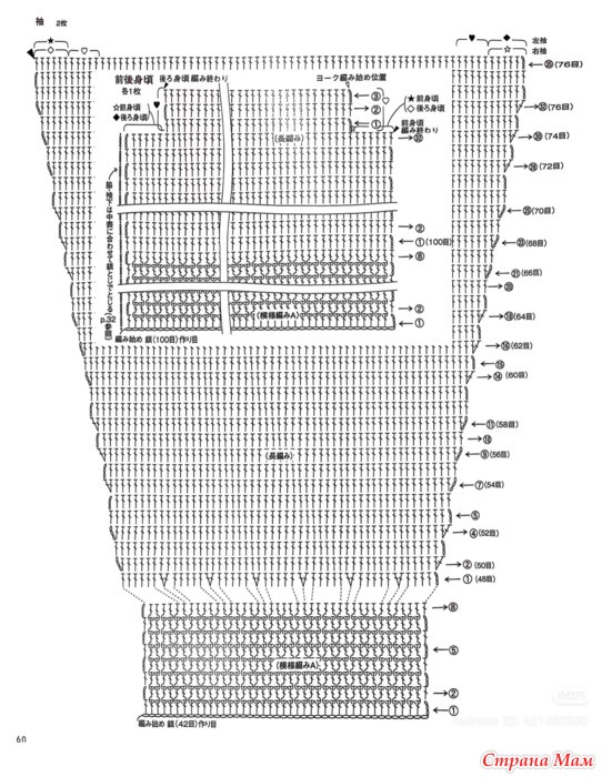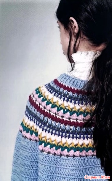Вяжите перед и спинку. Наберите 100 воздушных петель светло-голубой нитью, провяжите 8 рядов узором А и 32 ряда столбиков с накидом. Для спинки оставьте по 6 петель с каждой стороны и провяжите ещё 3 ряда для переда и спинки.