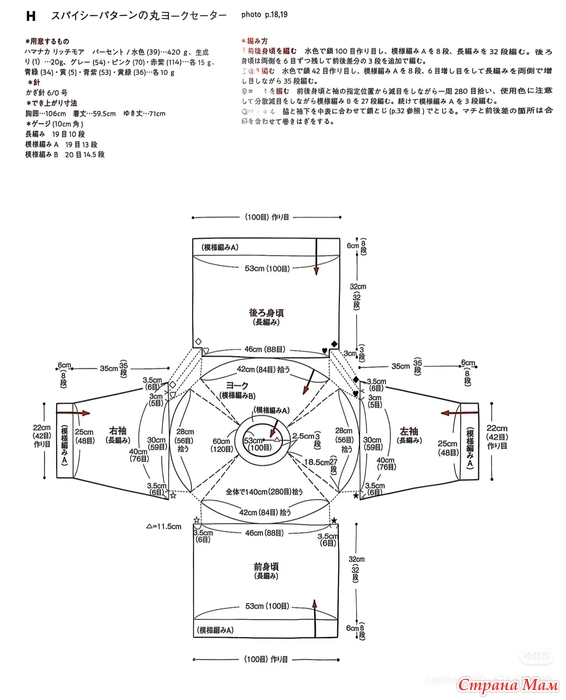Набрать 280 петель по переду, спинке и рукавам, убавляя петли в указанных местах, затем вязать 27 рядов узором B, распределяя убавки, обращая внимание на используемые цвета. Провязать 3 ряда узора.