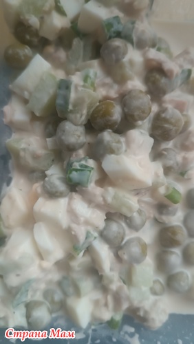А... Вспомнила, делала новый салат: тунец, консервированный горошек, свежий огурец, вареные яйца, зеленый лук, заправка греческий йогурт и горчица.