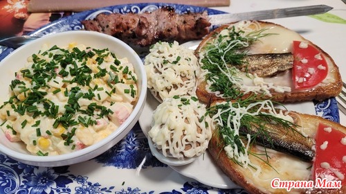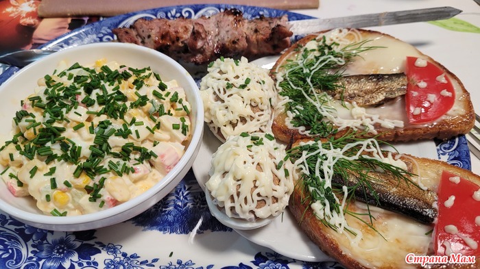 У нас был борщ, соседи принесли шашлык, бутерброды со шпротами, салат с отобранными у крабов палками и у кур яйцами. С кукурузой. И маюнезиком.