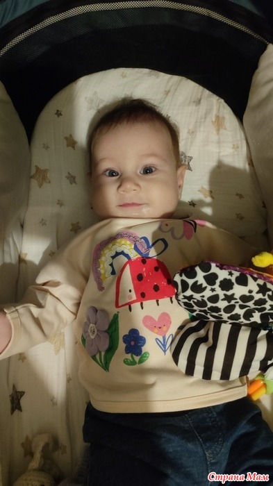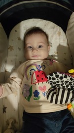 Уже стоит, сидит, ползает, лепечет МАМА ПАПА. Обожает своих старших, Нику и её энергичность иногда пугается.