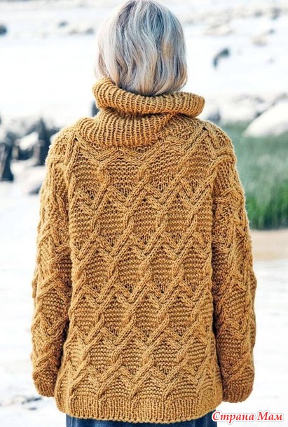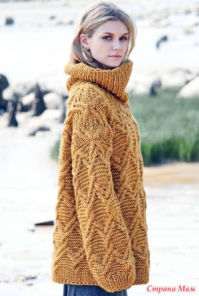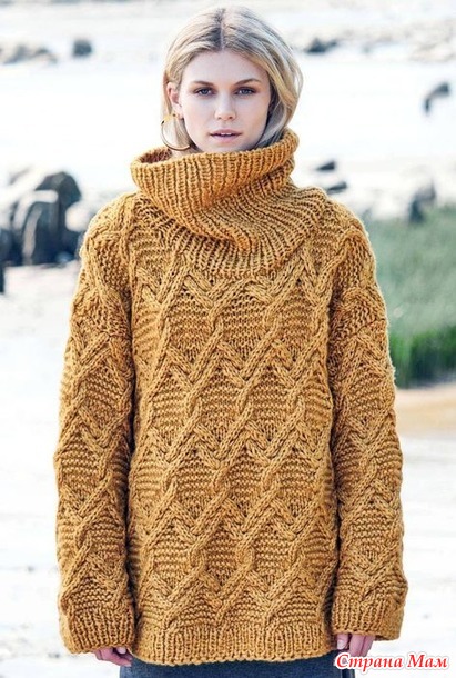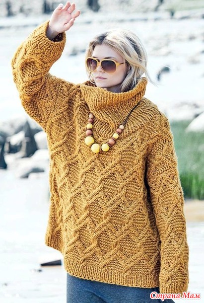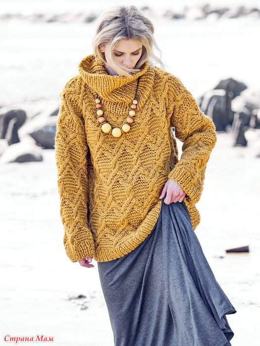 Горчичный свитер оверсайз с широким воротом и арановыми переплетениями. Спицы.