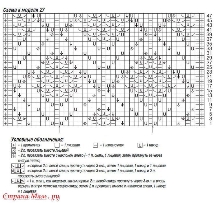 Плотность вязания: узор 3-19 п. х 23,5 р. = 10 х 10см.