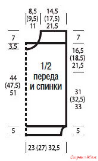 Перед: вязать, как спинку, но через 44 см = 104 р. (47,5 см = 112 р.) 51 см = 120 р. от нижней планки закрыть для горловины средние 19 п. и обе стороны закончить раздельно.