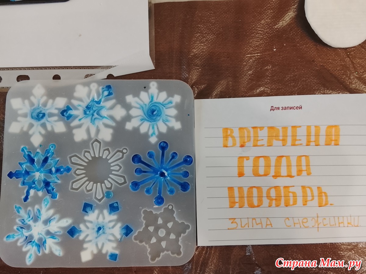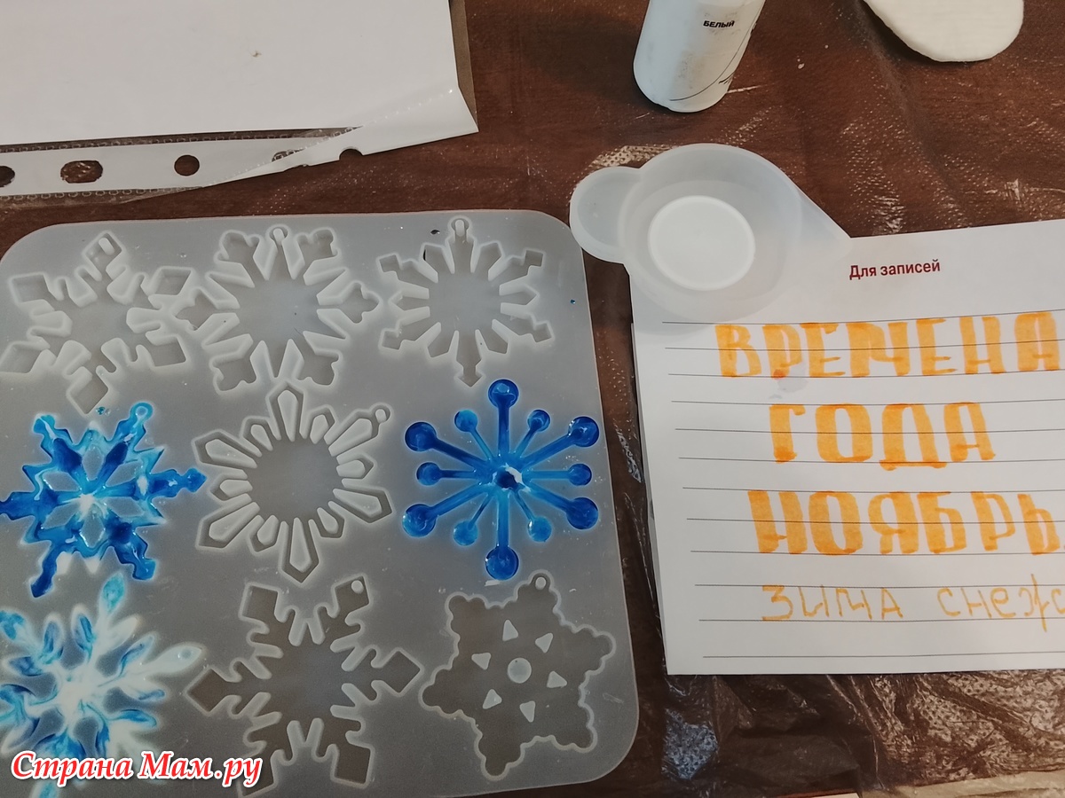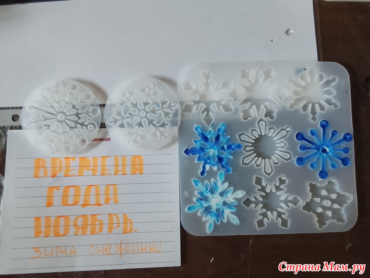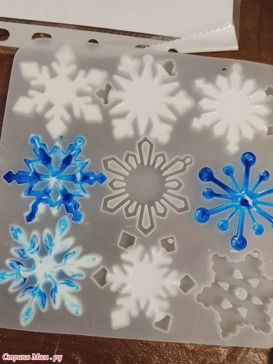 Добрый день! Мой отчёт за ноябрь. Снежинки. В этом месяце решила поработать смолой. В задании месяца писала, что будут снежинки и снежинок будет много. Заявку сделать не удалось, на сайт зайти не могла. Поэтому простите всё здесь и сразу. Материалы: эпоксидная смола, молды, красители белый и синий. И сразу начало работы: