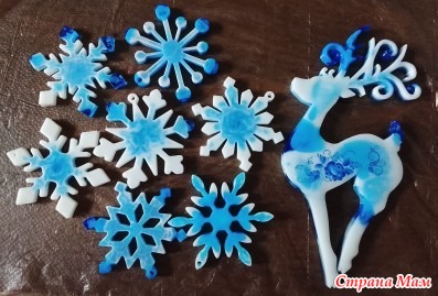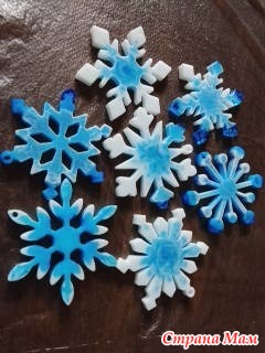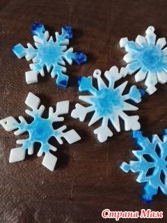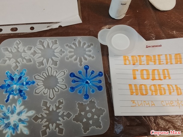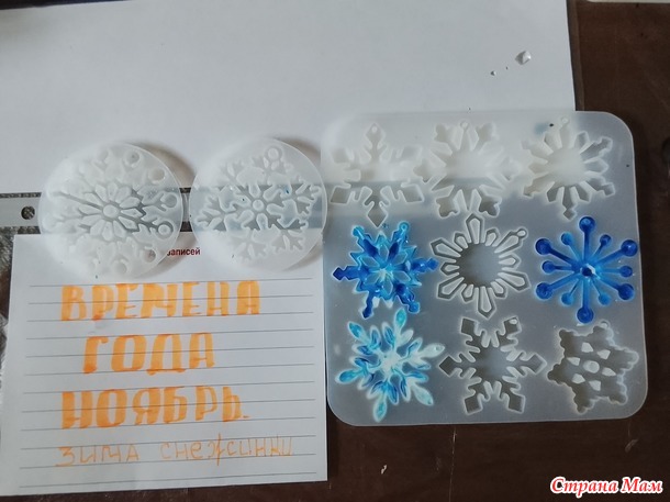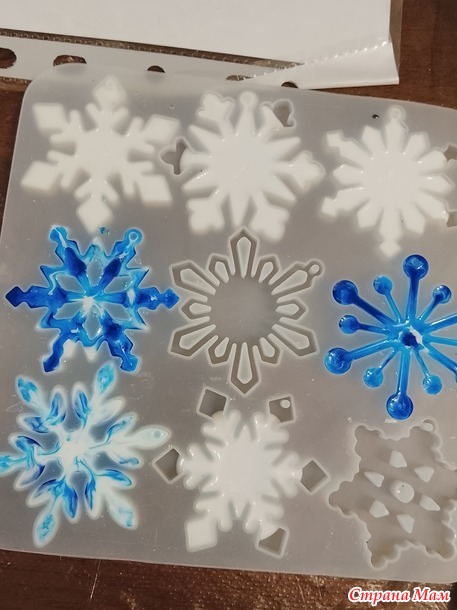 Снежинки. В этом месяце решила поработать смолой. В задании месяца писала, что будут снежинки и снежинок будет много. Заявку сделать не удалось, на сайт зайти не могла. Поэтому простите всё здесь и сразу. Материалы: эпоксидная смола, молды, красители белый и синий. И сразу начало работы: