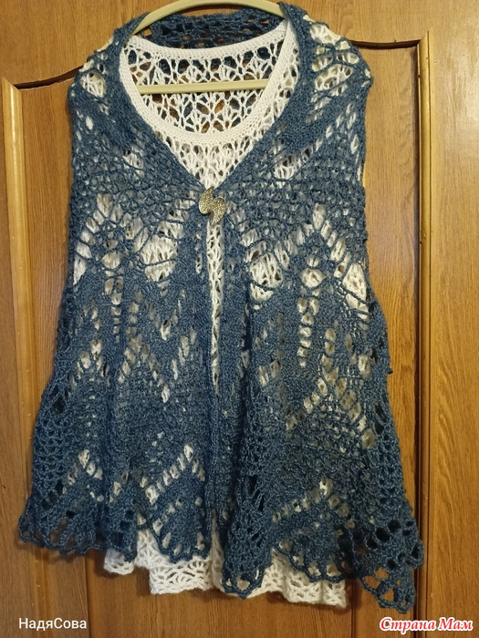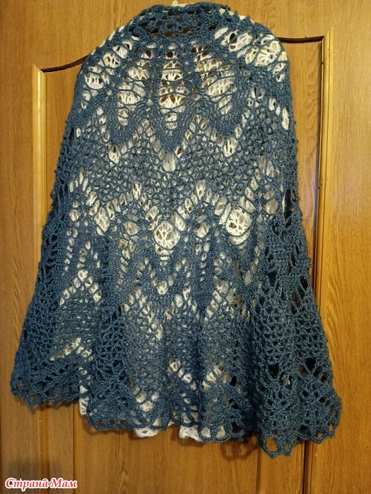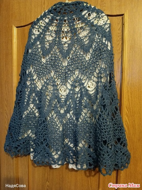 Один совет. В описании слева внизу схемы неточность. При вязании сеточкой лучше все столбики косые вязать отдельно. То есть не из одной петли и не соединять вверху одной петлей. Иначе все полотно стягивается и в центре получается пузырь. Проверено опытом. Пришлось распустить и связать столбики раздельно. И всё получилось, как надо!