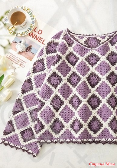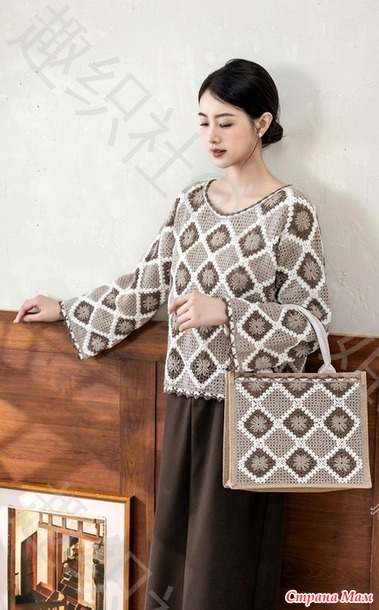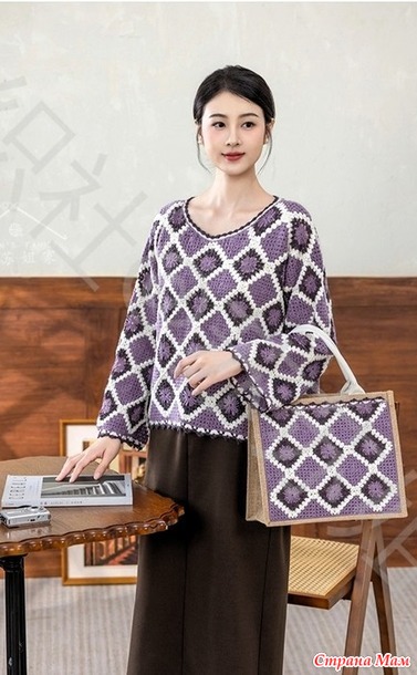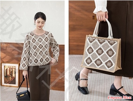 Джемпер и сумка из разноцветных квадратов расположенных по диагонали.