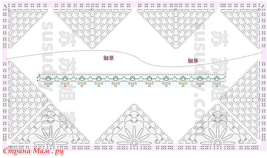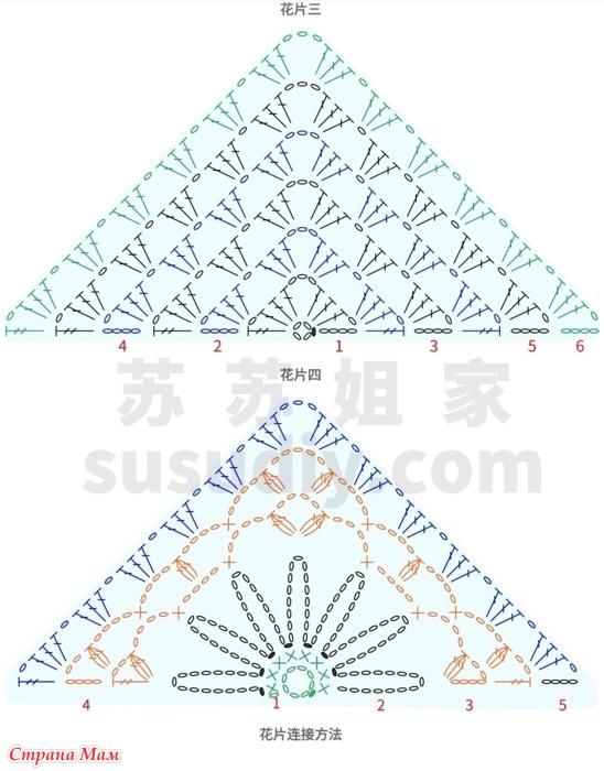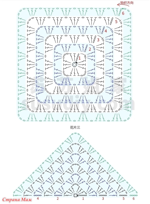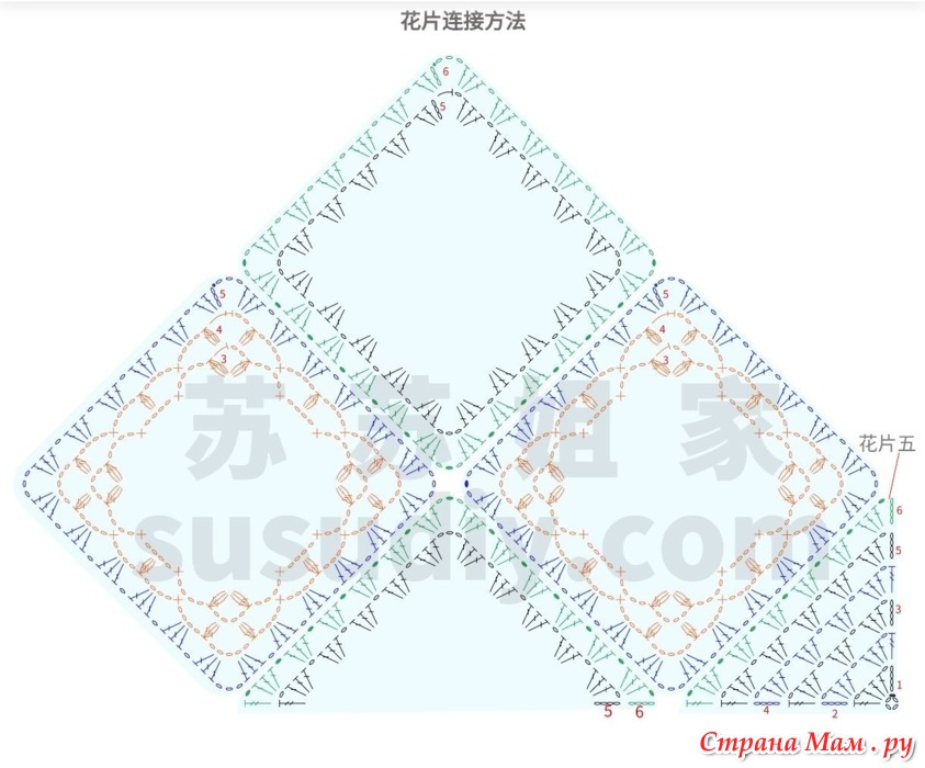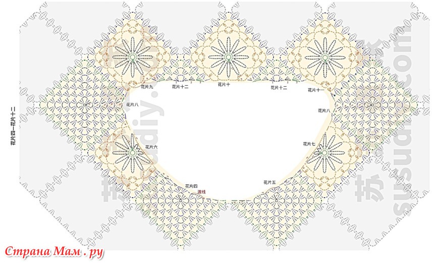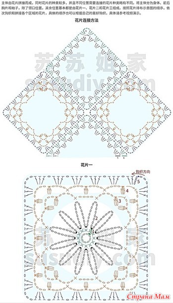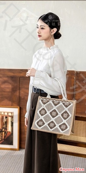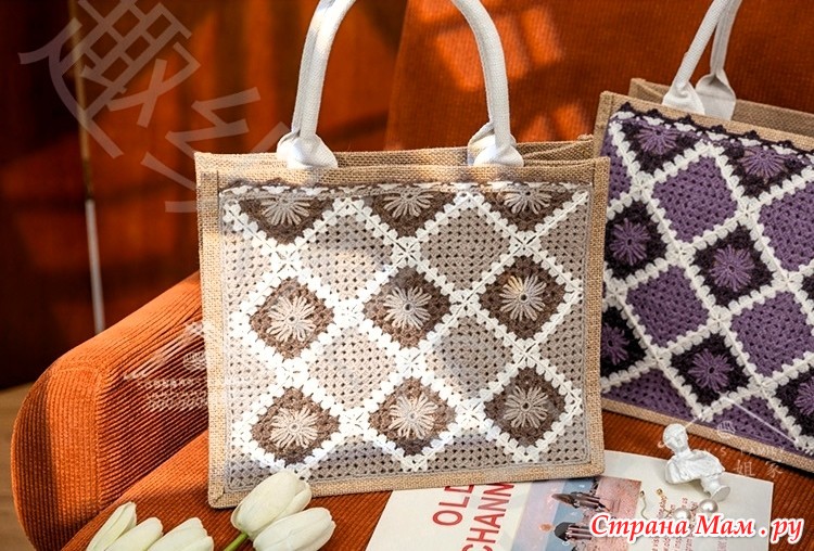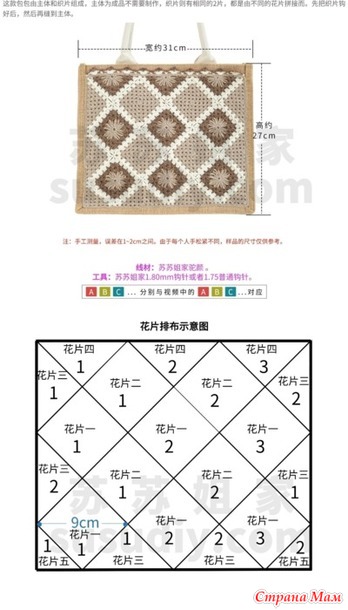Эта сумка состоит из основной части и двух тканых деталей. Основная часть — готовое изделие, не требующее изготовления. Тканые детали представляют собой две одинаковые детали, каждая из которых изготовлена ​​путём сшивания разных узорчатых мотивов. Сначала свяжите тканые детали крючком, а затем пришейте их к основной части.