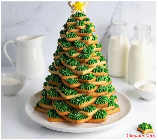 Вниз ставим самые большие печенья поворачивая лучи звезды так чтоб они не совпадали с предыдущей звездой. На серединку каждой звезды капаем глазурь. Готовые ёлки должны немного постоять чтоб глазурь засохла и крепко соеденила звездчки между собой.