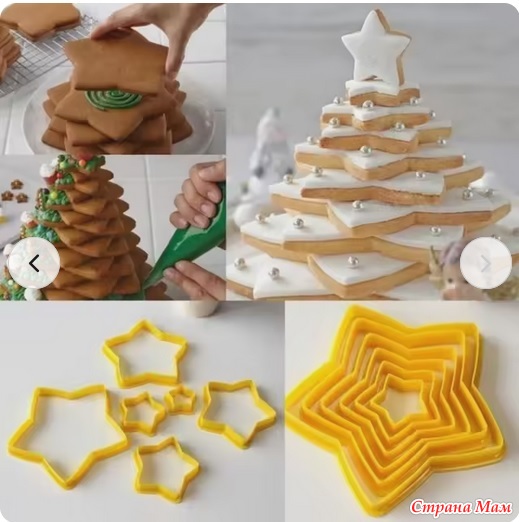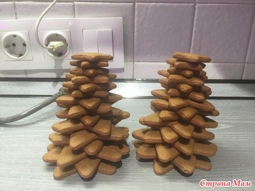 Вниз ставим самые большие печенья поворачивая лучи звезды так чтоб они не совпадали с предыдущей звездой. На серединку каждой звезды капаем глазурь. Готовые ёлки должны немного постоять чтоб глазурь засохла и крепко соеденила звездчки между собой.