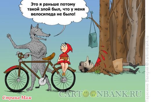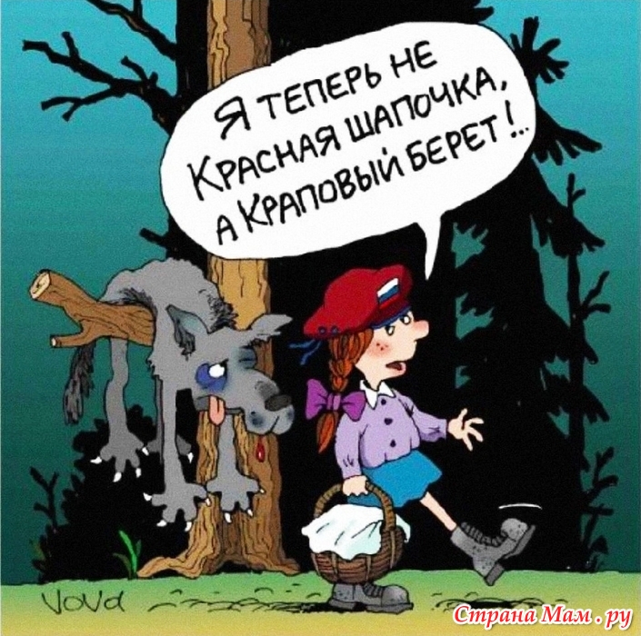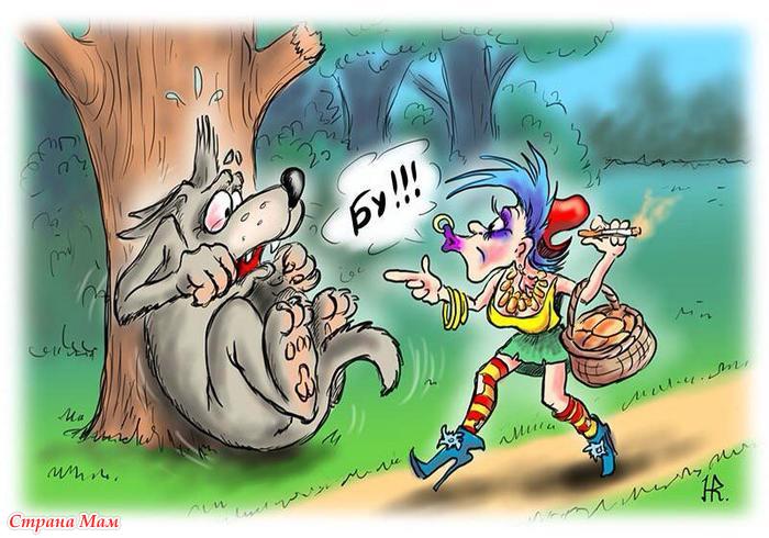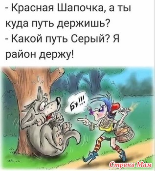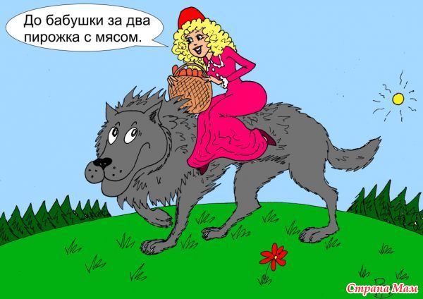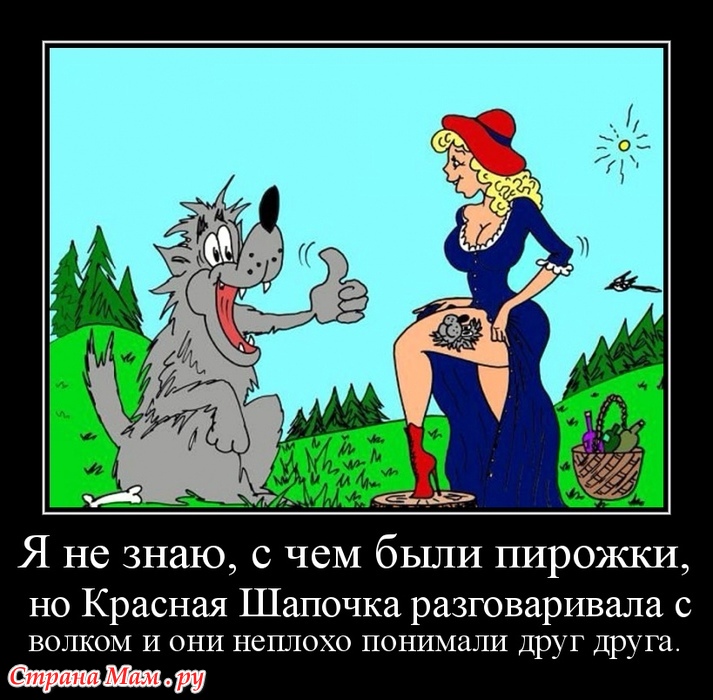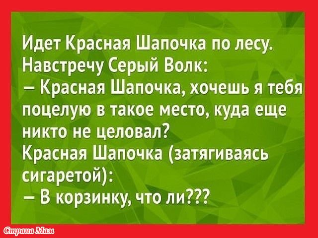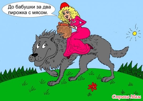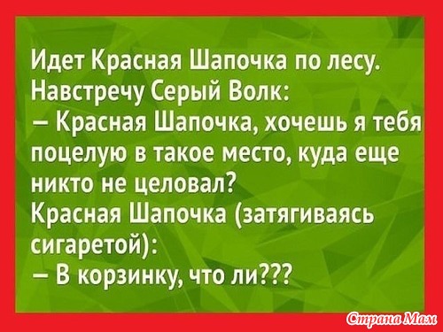 Волк показьiвает голову из куста и говорить: "Красная шапочка, у тебя пирожки?"