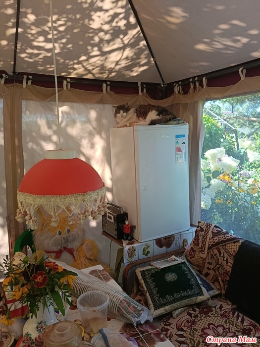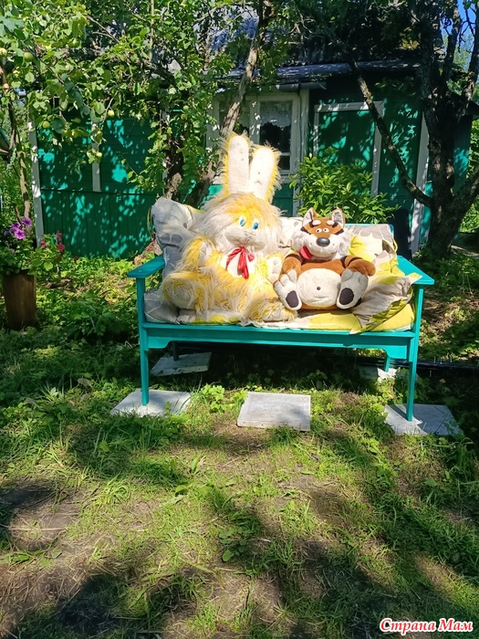 Вот бы и оставались на скамейке... Зачем в шатёр-то их пускать.... Зайца всё время на холодильник сажают.... На самое тёплое местечко....