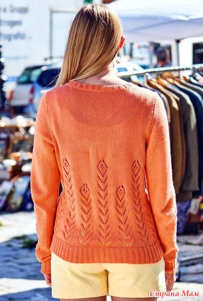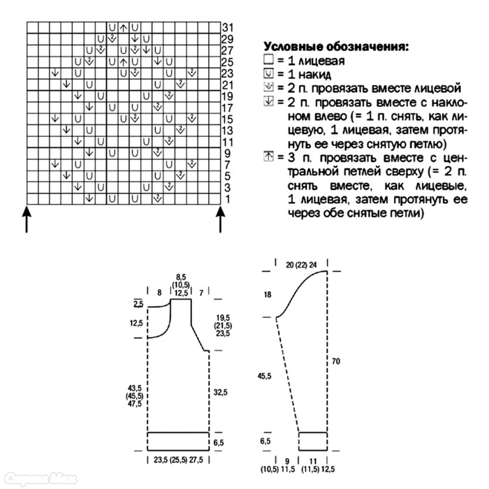 Все петли закрыть, при этом в местах закруглений на горловине переда провязать 4 раза по 2 п. вместе изнаночной. Вшить рукава.