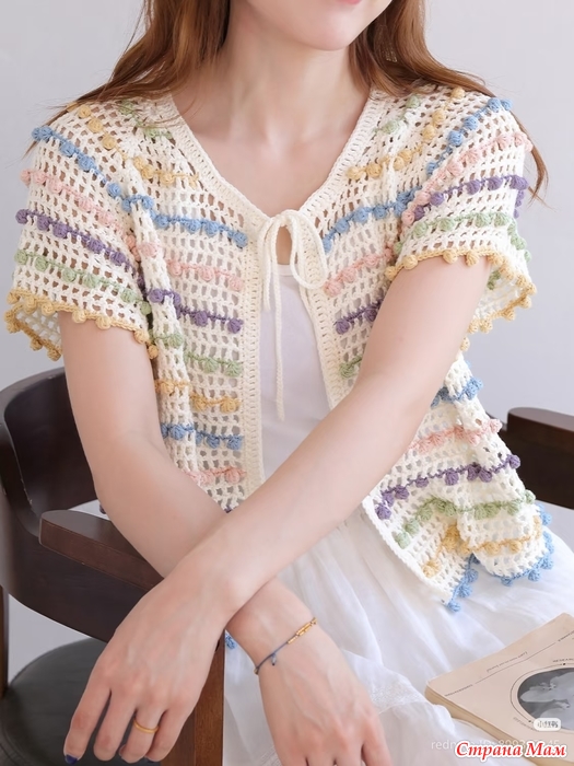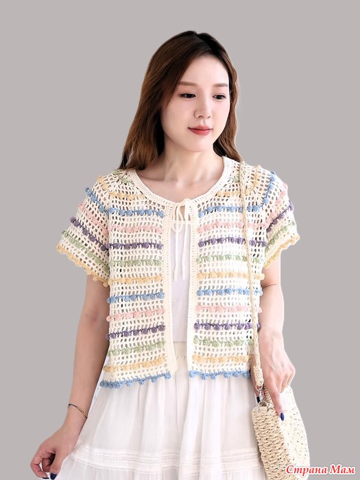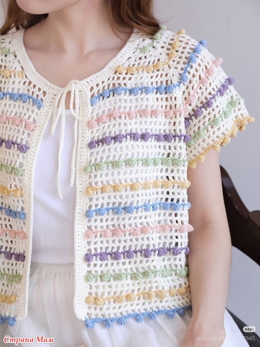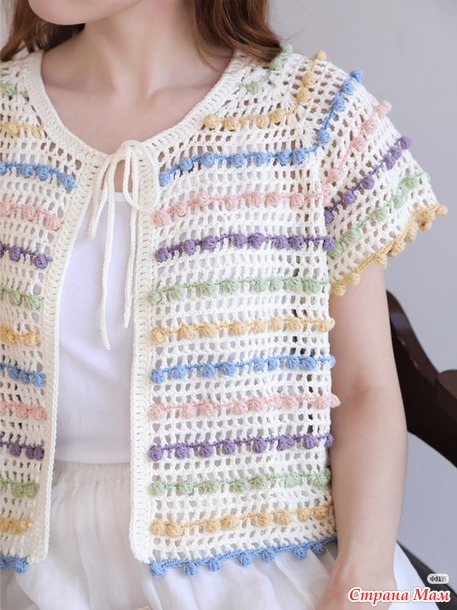 Ажурный кардиган с круглой кокеткой в тонкую разноцветную полоску из узора шишечки