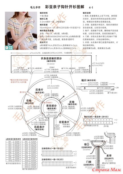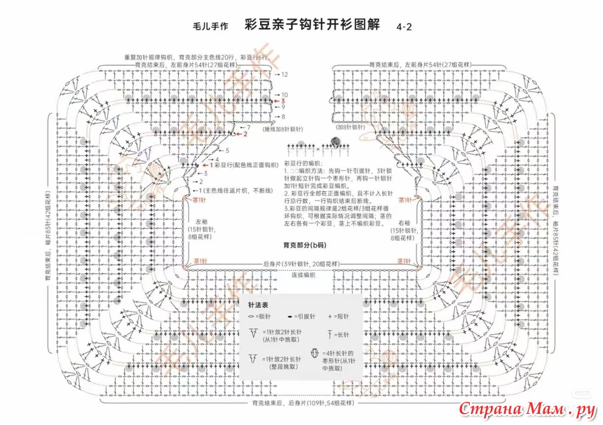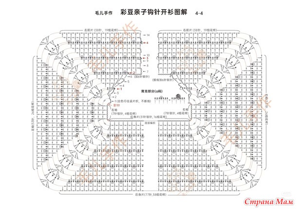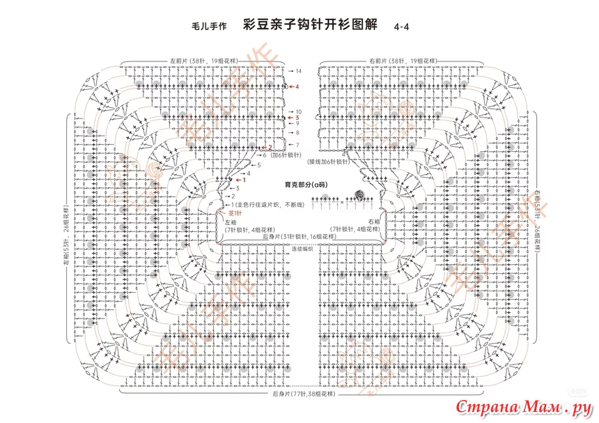 1. Кокетка: Вяжите крючком всю деталь туловища сверху вниз, прибавляя петли, как показано на схеме. Прибавляя петли для резинки, также увеличивайте петли для выреза горловины переда. Продолжайте прибавлять петли по схеме, пока не достигнете нужного обхвата груди.