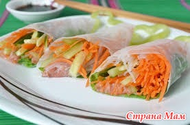 6 листов рисовой бумаги, 6 листов пекинской капусты, 1 морковь, 1/2 огурца, 100 г копченого лосося.