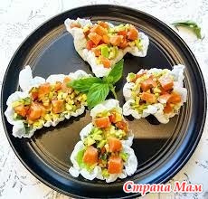 К слабосоленому лососю добавьте несколько листочков салата (просто скрутите в руках в трубочку), соломку из авокадо и из огурца, а также мягкий сыр.