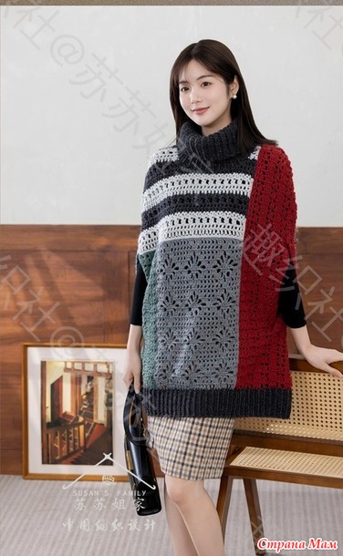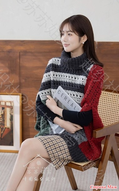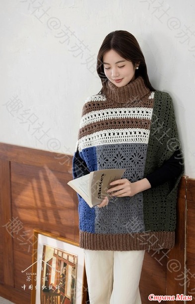 Теплое пончо печворк с высокими воротом и прорезями для рук.