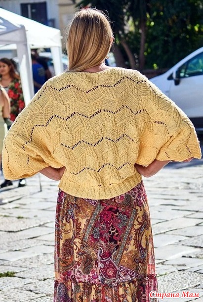 На прибавленных петлях продолжать выполнять ажурный узор.